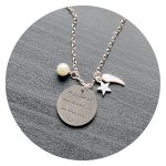 Deze ketting bevat een label met tekst, een engelenvleugeltje, een sterretje en een mooie, op een parel lijkende kraal.