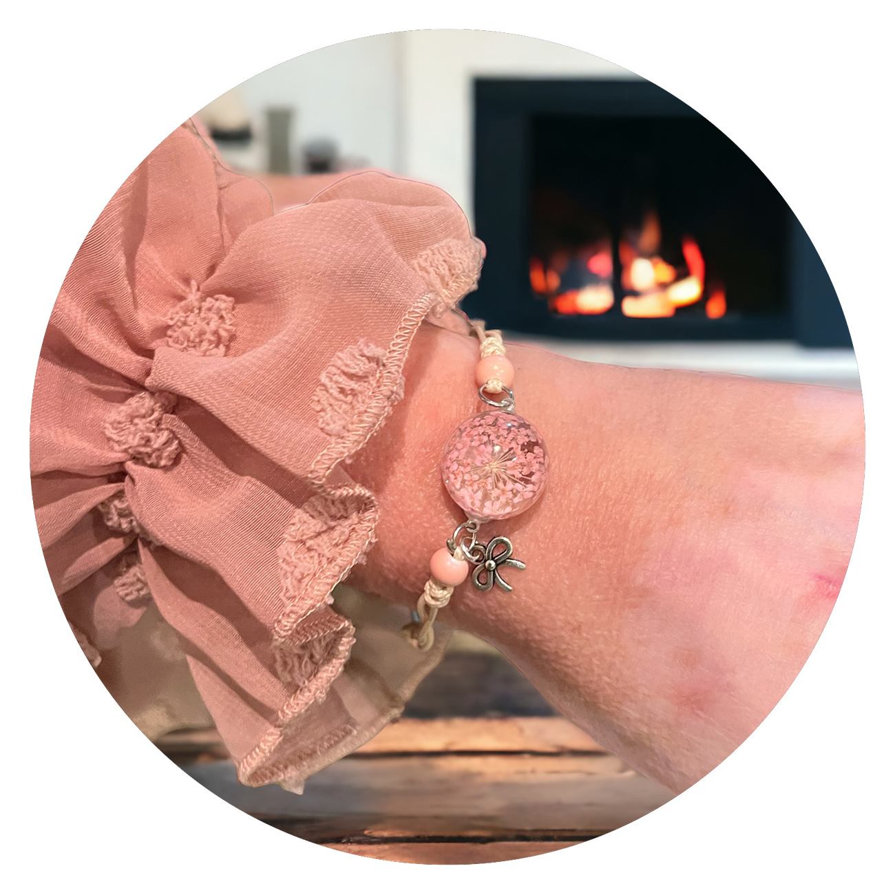 Een crèmekleurige verstelbaar armbandje met daaraan een lief strikje en in het ronde glas een prachtig roze bloemetje. Een armbandje wat liefde, zachtheid, warmte uitstraalt. Een armbandje wat je eraan doet herinneren dat een bloemetje ook eerst als zaadje begonnen is en met water, zonlicht en jawel, liefde en geduld, heeft kunnen groeien tot de schoonheid die ze nu is.