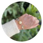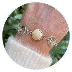 Twee cabochons aan deze armband zijn voorzien van bloemetjes, de middelste is roomwit met een vleugje zacht geel. Een kleur die staat voor harmonie. Voor de behoefte en de mogelijkheid tot verzoenen. Deze kleur staat ook voor een tweede kans.