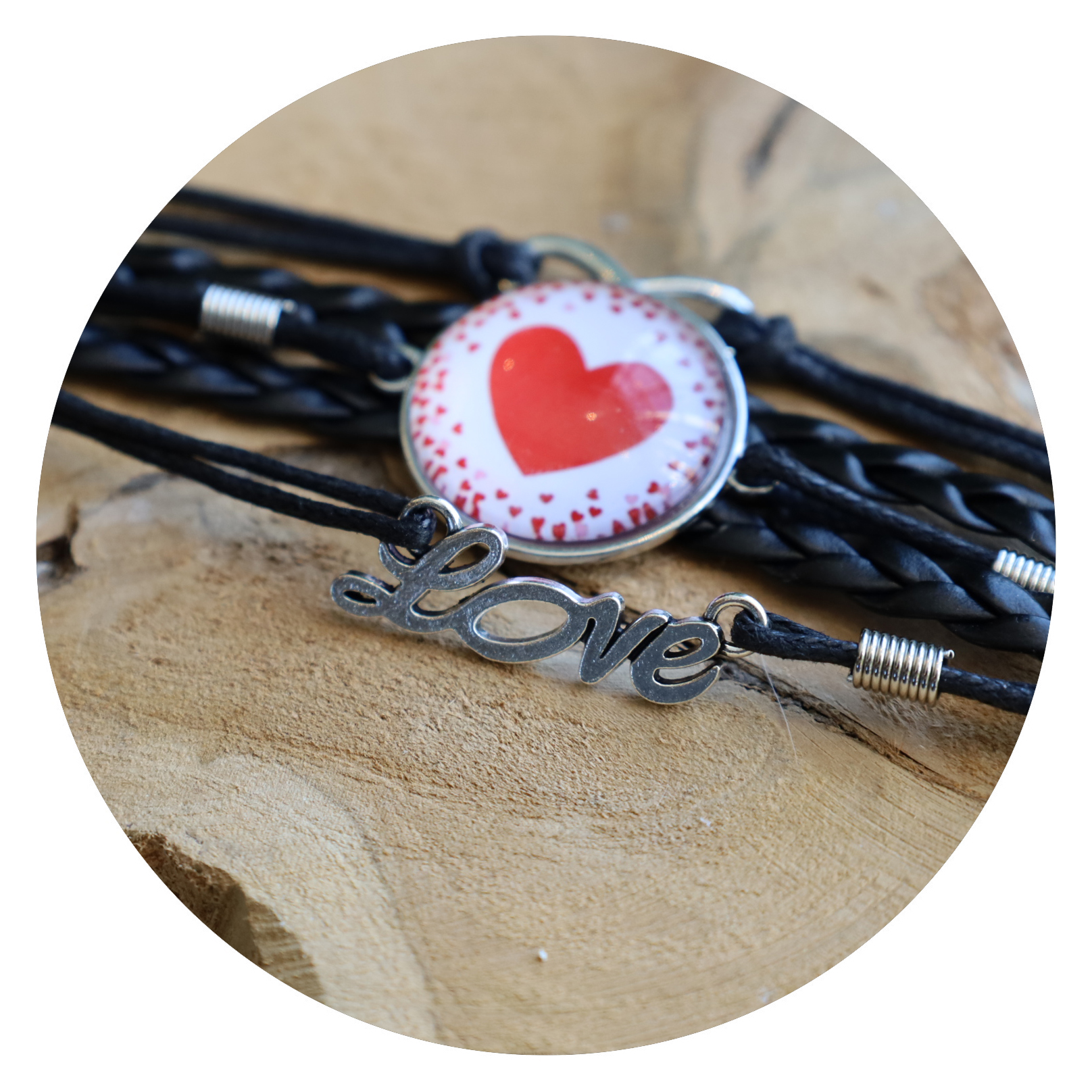 Een gevlochten armband in zwart of wit met een rood, kloppend hart en het woordje LOVE. Ook hangt er het INFINITY teken aan, wat betekent dat de liefde eindeloos is.