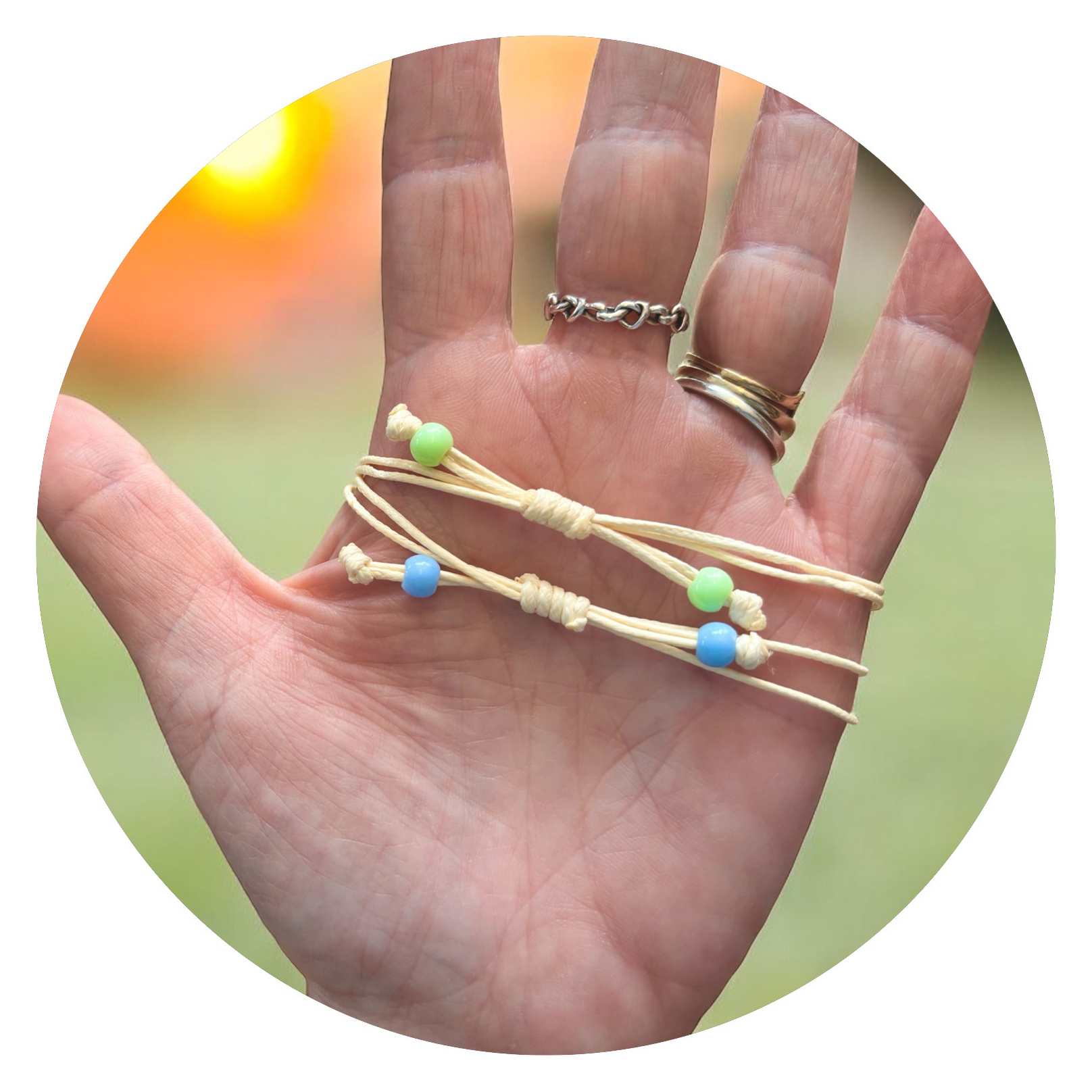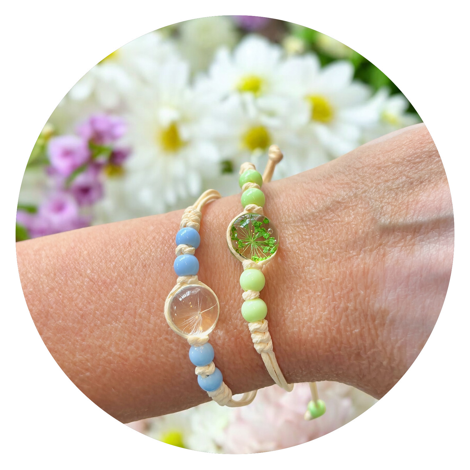 Een eenvoudig, crèmekleurig verstelbaar armbandje, met enkele kraaltjes en een mooie glazen cabochon voorzien van een paardenbloempluisje of klavertjes vier.