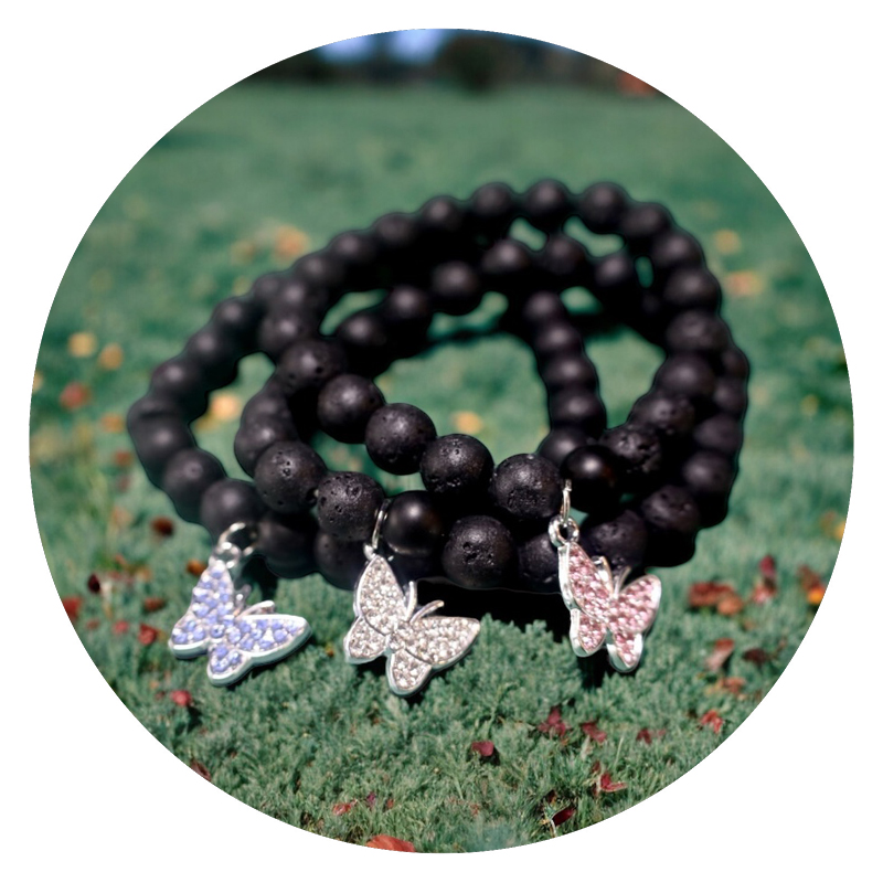 Kleur: zwarte vulkaankralen met een roze, blauw of wit zilverkleurig vlindertje