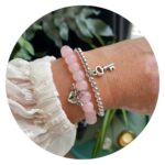 Materiaal: rozenkwarts, elastiek, kunststof en stainless steel