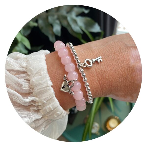 Een lieve set van drie armbandjes, waarvan twee rozenkwarts kraaltjes hebben. Het derde armbandje is van zilverkleurige kraaltjes gemaakt en ieder armbandje heeft een bedeltje.Zo hangt er een engelenvleugeltje aan, een slotje in de vorm van een hart met vleugeltjes en een klein sleuteltje. Open deuren die tot nu gesloten bleven en doe een stap vooruit, naar nieuwe kansen en nieuwe uitdagingen. Voel de liefde, want rozenkwarts, de steen van het hart, brengt zachte energie en harmonie in je leven. Draag ze samen of apart, en laat je omringen door een vleugje liefde, positiviteit en innerlijke rust.