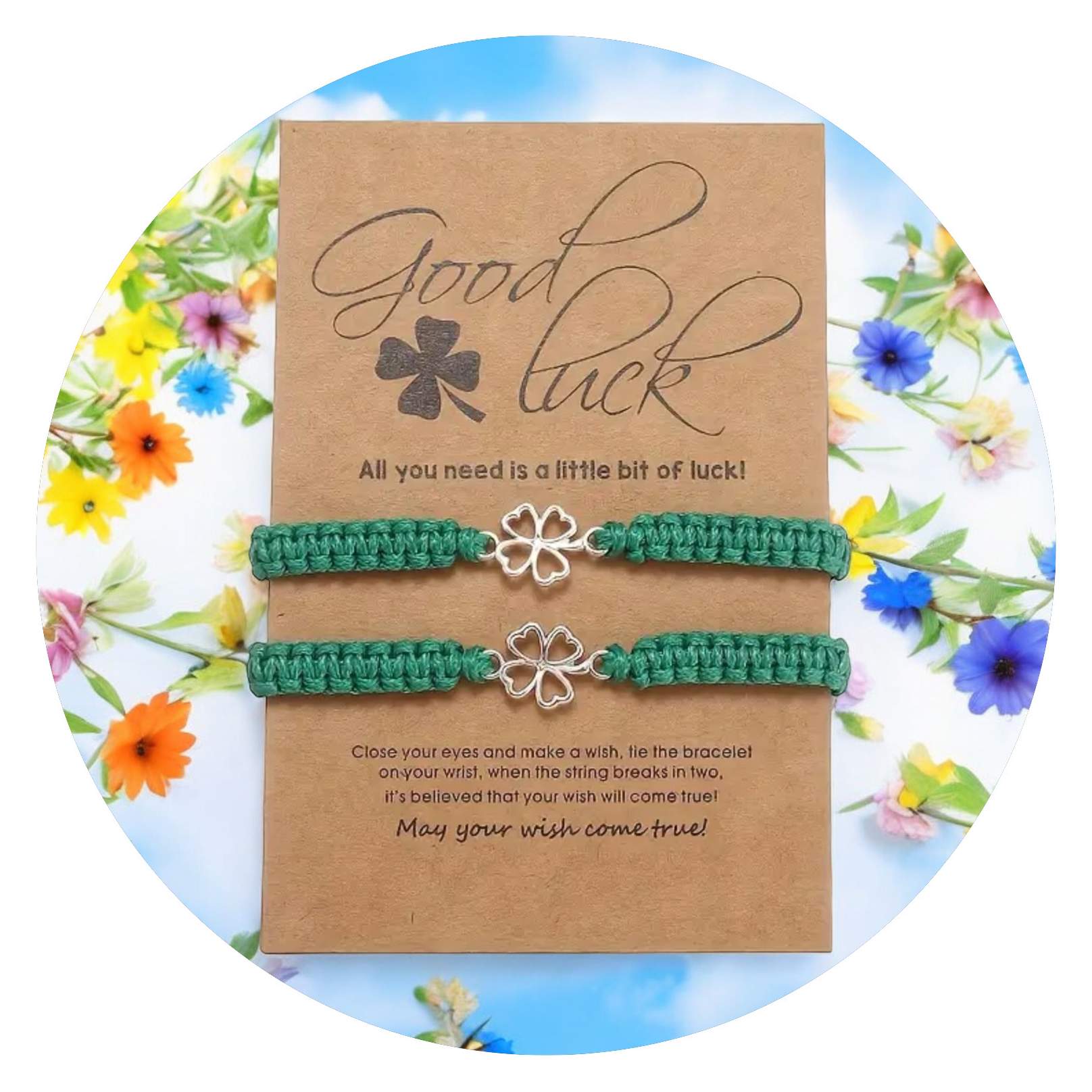 Deze set van twee armbandjes met een klavertje vier is speciaal bedoeld voor twee mensen die zich verbonden voelen met elkaar. Het verstelbare touw symboliseert de flexibiliteit en kracht van jullie band en maakt dat hij iedereen past. En wist je dat, als het touwtje breekt, je een wens mag doen? Zo blijft geluk altijd met jullie meegaan, waar jullie ook zijn.