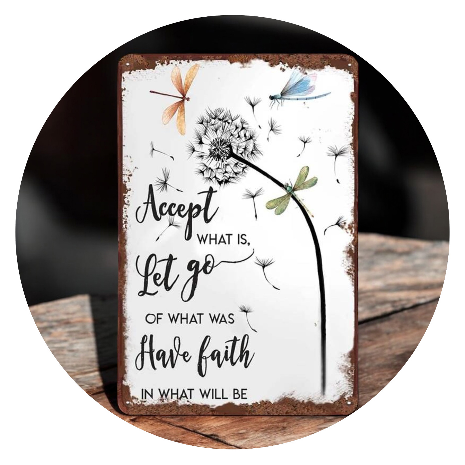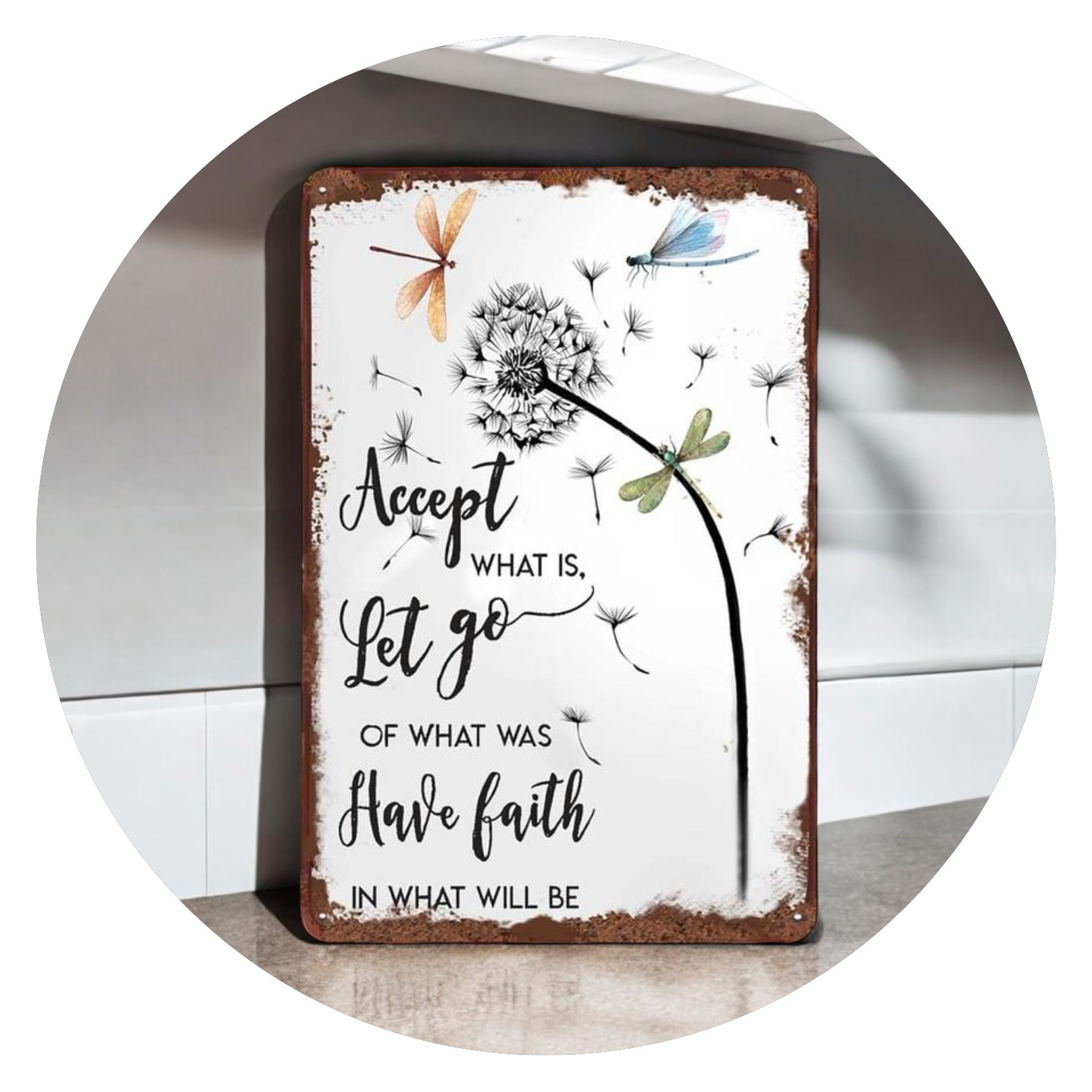 Dit bord is zo groot als een a4-tje, met een inspirerende quote erop. De stijl is vintage, dus het lijkt verweerd materiaal te zijn, met hier en daar een aantal roestplekjes.