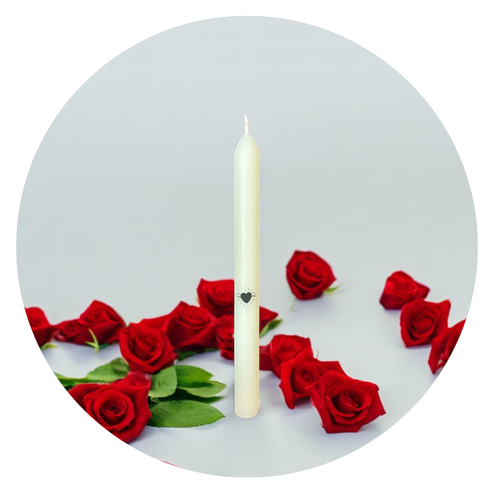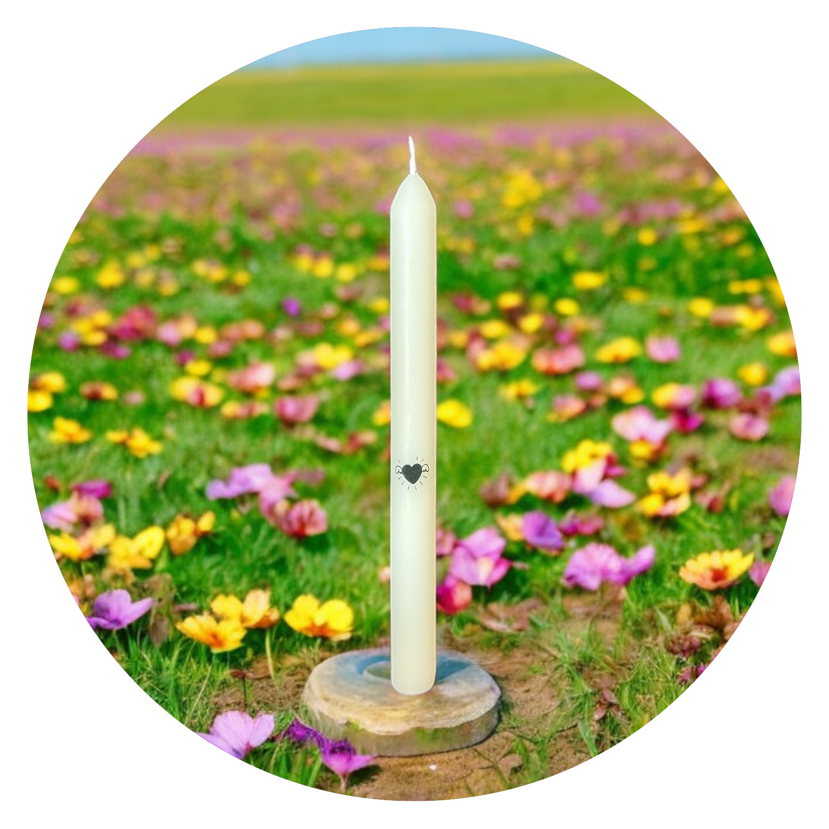 Deze prachtige gladde kaars is maar liefst 23 centimeter hoog en brandt zo’n acht uur. Halverwege zijn ranke lijf vind je een lieve afbeelding van een hartje met vleugeltjes.