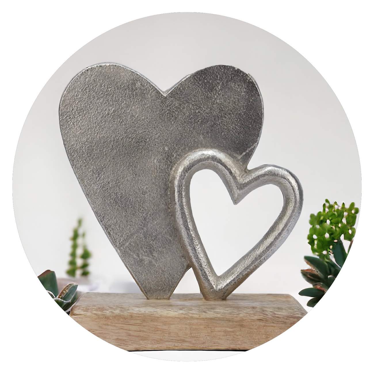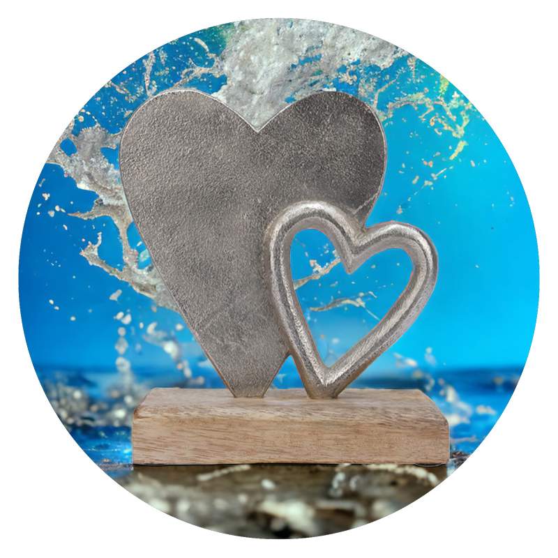 Op een stevige mangohouten voet staan deze twee harten gebroederlijk samen. Omdat ze bij elkaar horen, elkaar versterken, omdat ze letterlijk samengesmolten zijn. Zoals je dat maar heel zelden in je leven tegenkomt, iemand die biologisch gezien weliswaar geen familie is, maar waarvan je hart weet dat jullie bij elkaar horen. Omdat jullie elkaar versterken en aanvullen.