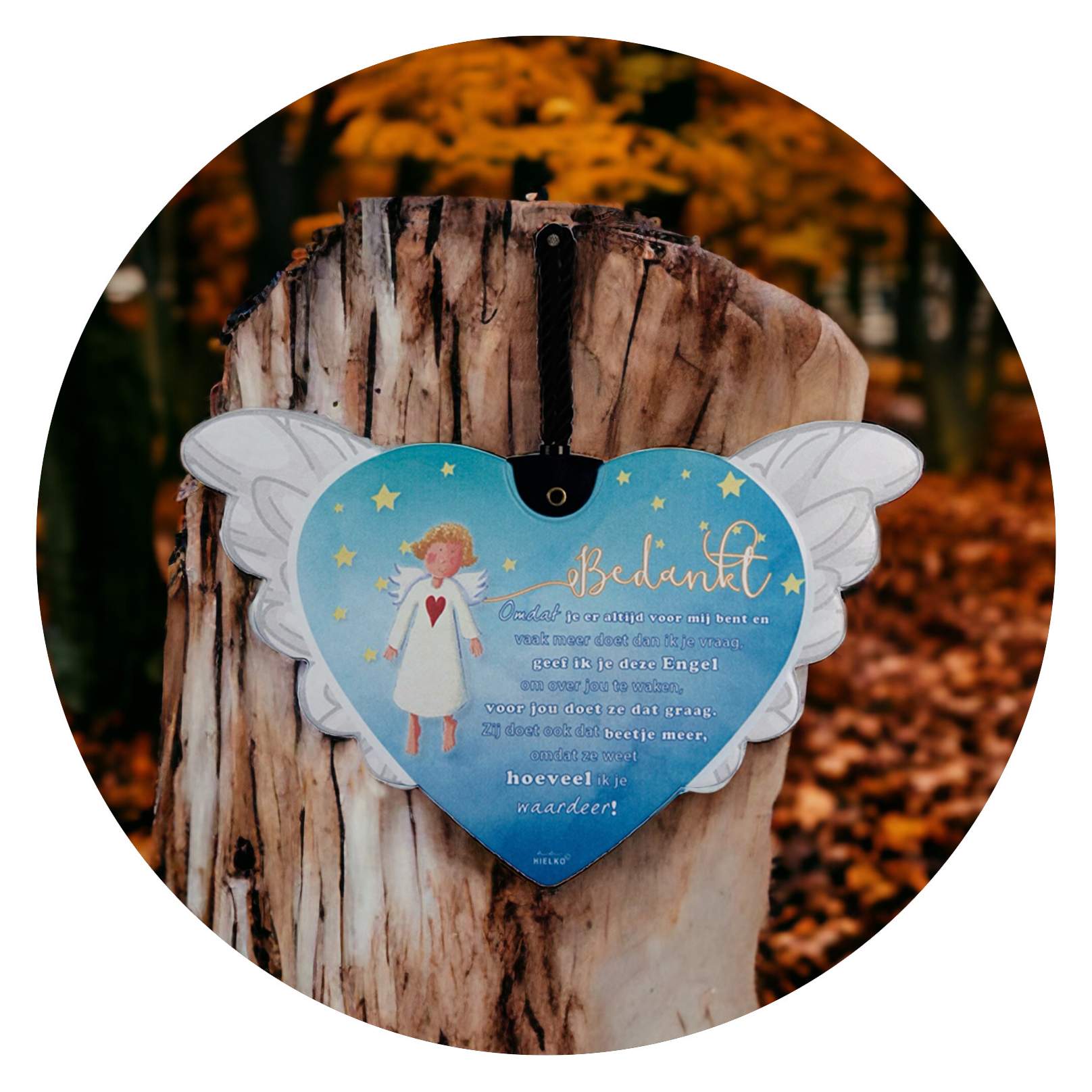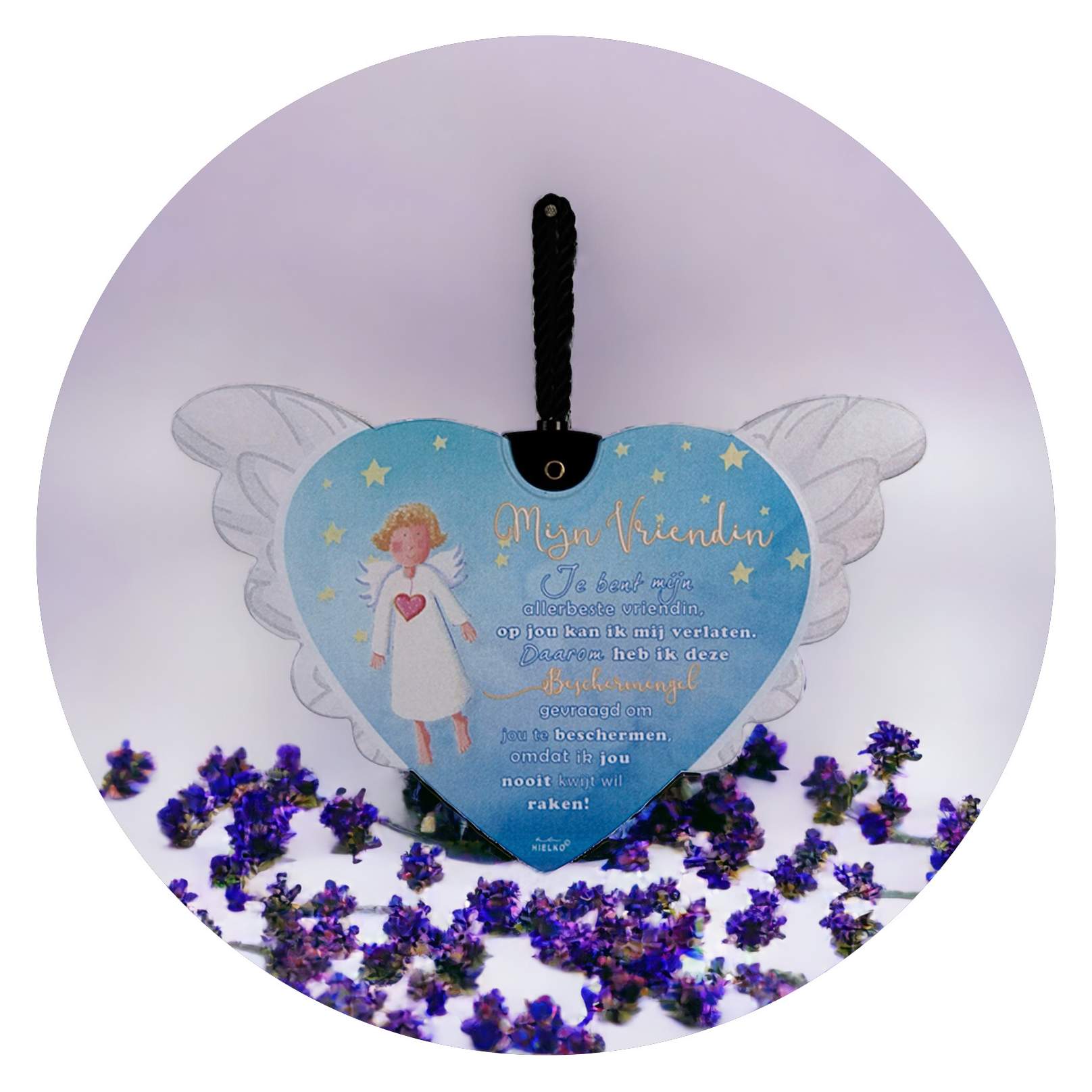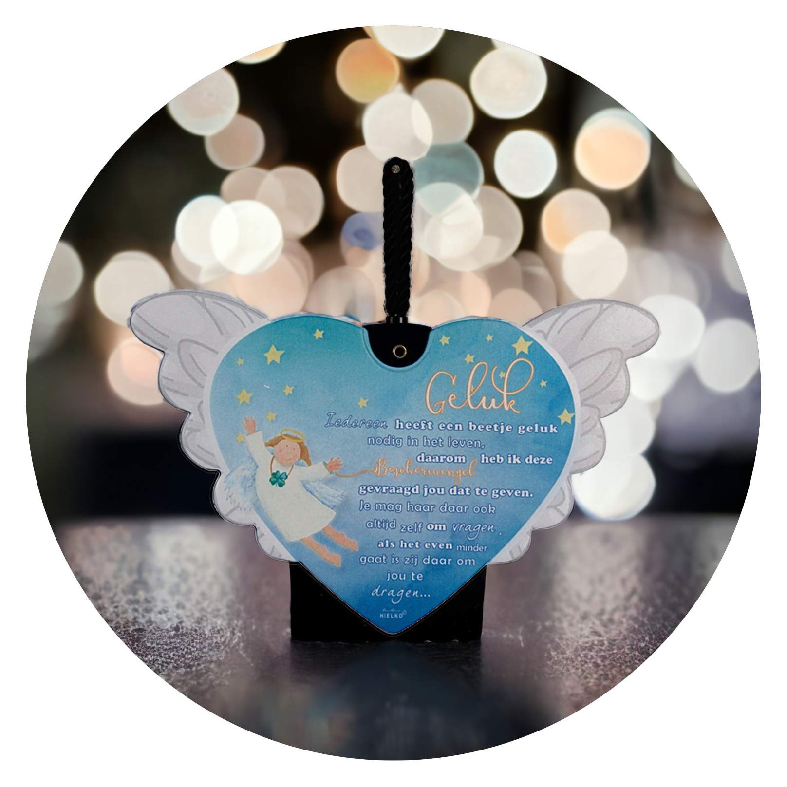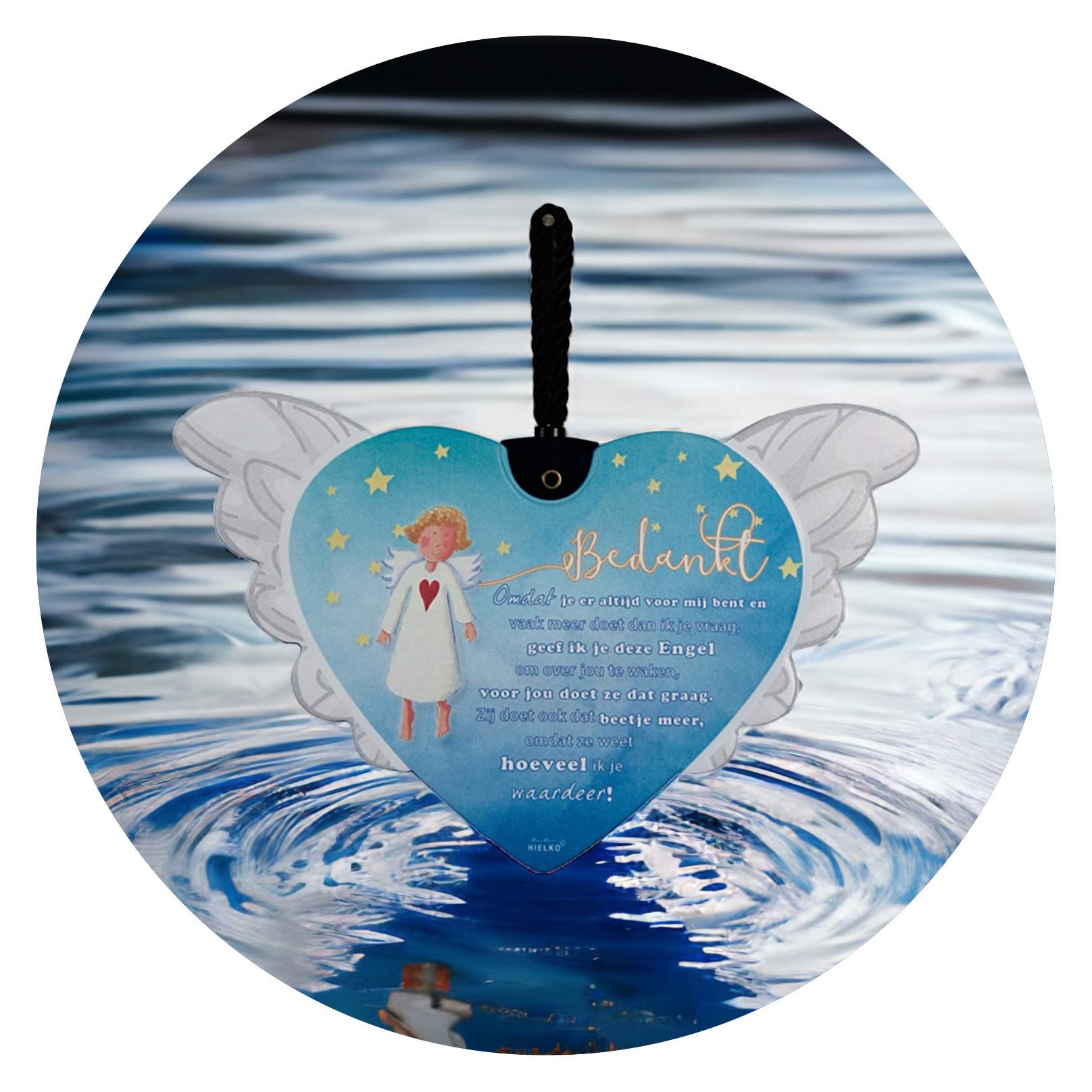 Ieder hart is voorzien van twee witte vleugels, de afbeelding van een engeltje, en een klein, lief gedichtje.