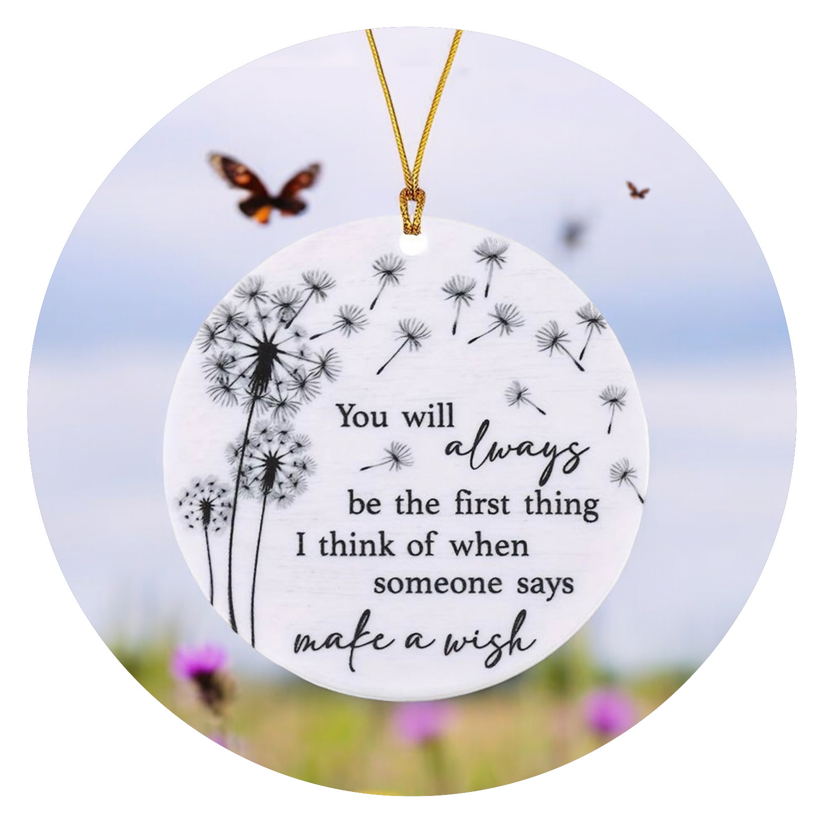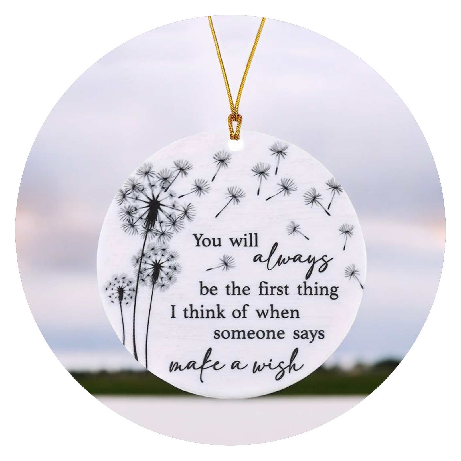 Het is een eenvoudige hanger, lief en rond, met de afbeelding van enkele paardenbloemen en pluisjes. Stel dat één van die pluisjes jouw wens zou vervullen…?