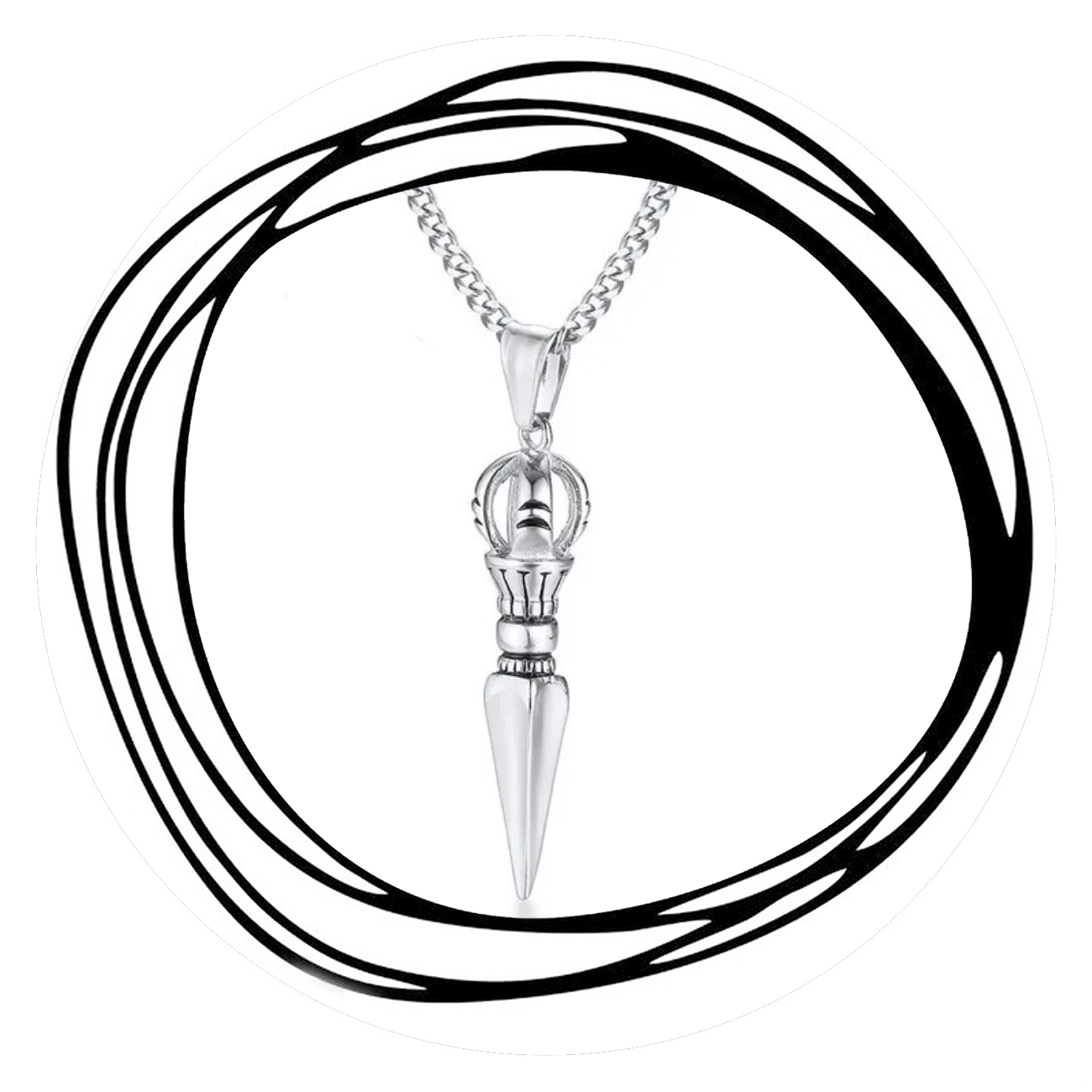 Deze robuuste en stevige geschakelde ketting in een prachtige zilveren kleur, bevat een Tibetaanse dolkamulet. Een dolkamulet wordt ook wel een Phurba genoemd.