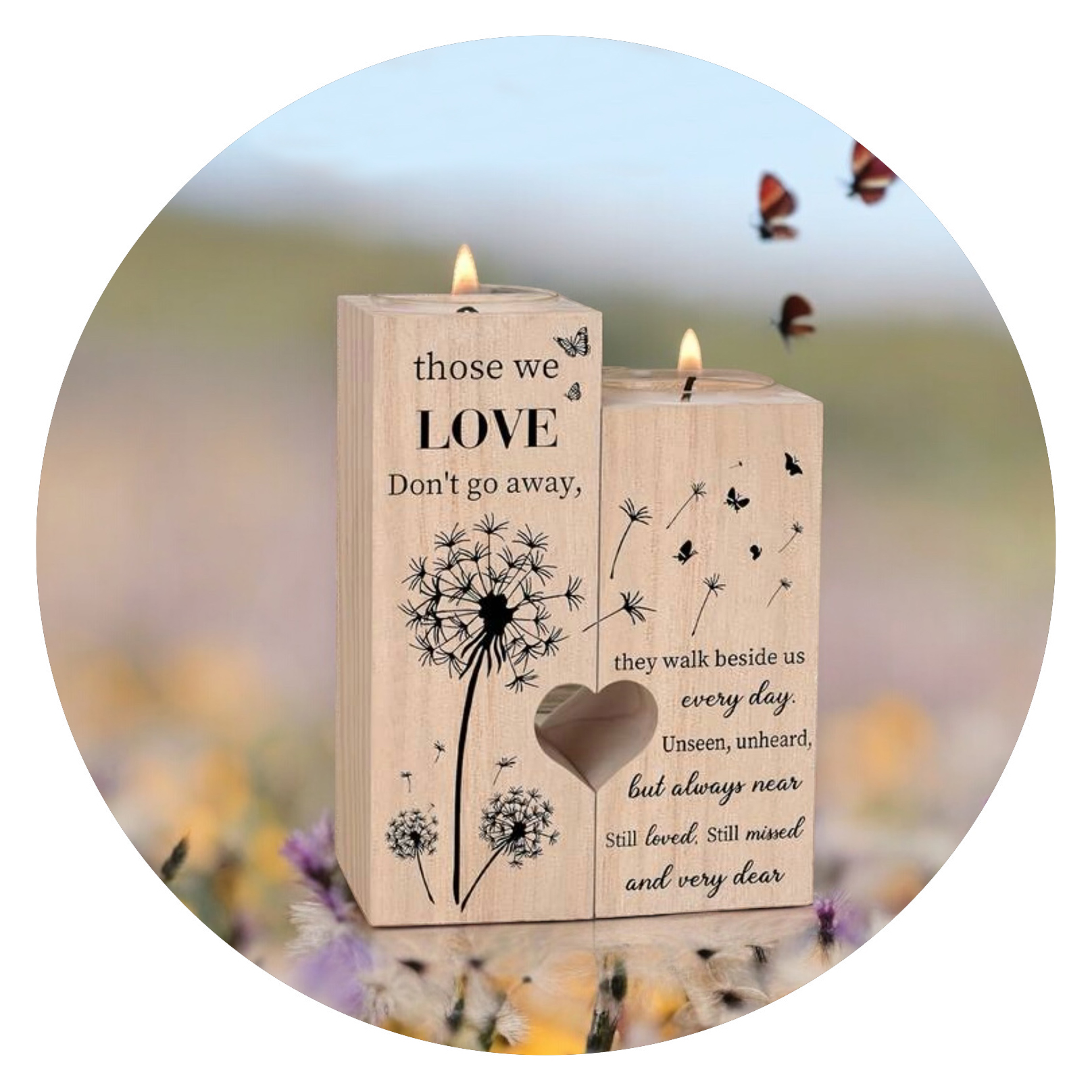 Deze set bestaat uit twee houten blokken waar een waxinelichtje in past. Hoewel je ze ook los neer kunt zetten, horen ze natuurlijk eigenlijk bij elkaar. Niet alleen omdat de uitsneden halverwege samen voor een liefdevol hartje zorgt, maar ook gaat de tekst van de linker kandelaar over in de tekst van de rechter.