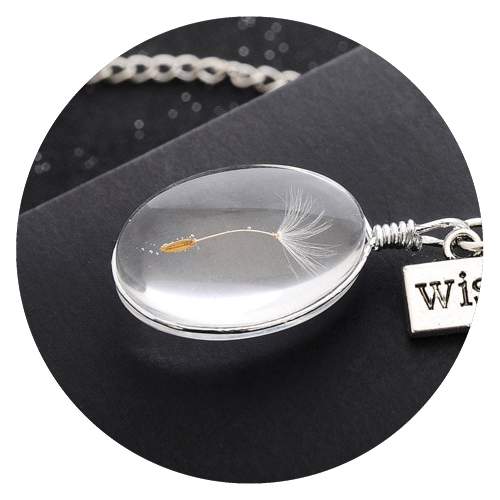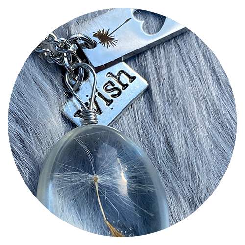 In deze ketting zit zo’n pluisje, hij is tijdens het glasblazen meegenomen en zit dus in het glas vast. Aan de ketting zit tevens het woordje ‘wish’ en een zilverkleurig label waaruit een hartje is gesneden en het pluisje uit ons logo is gebrand. Omdat het echte paardenbloempluisjes zijn, is ieder artikel uniek en zijn er kleine verschillen mogelijk ten opzichte van de afbeelding.