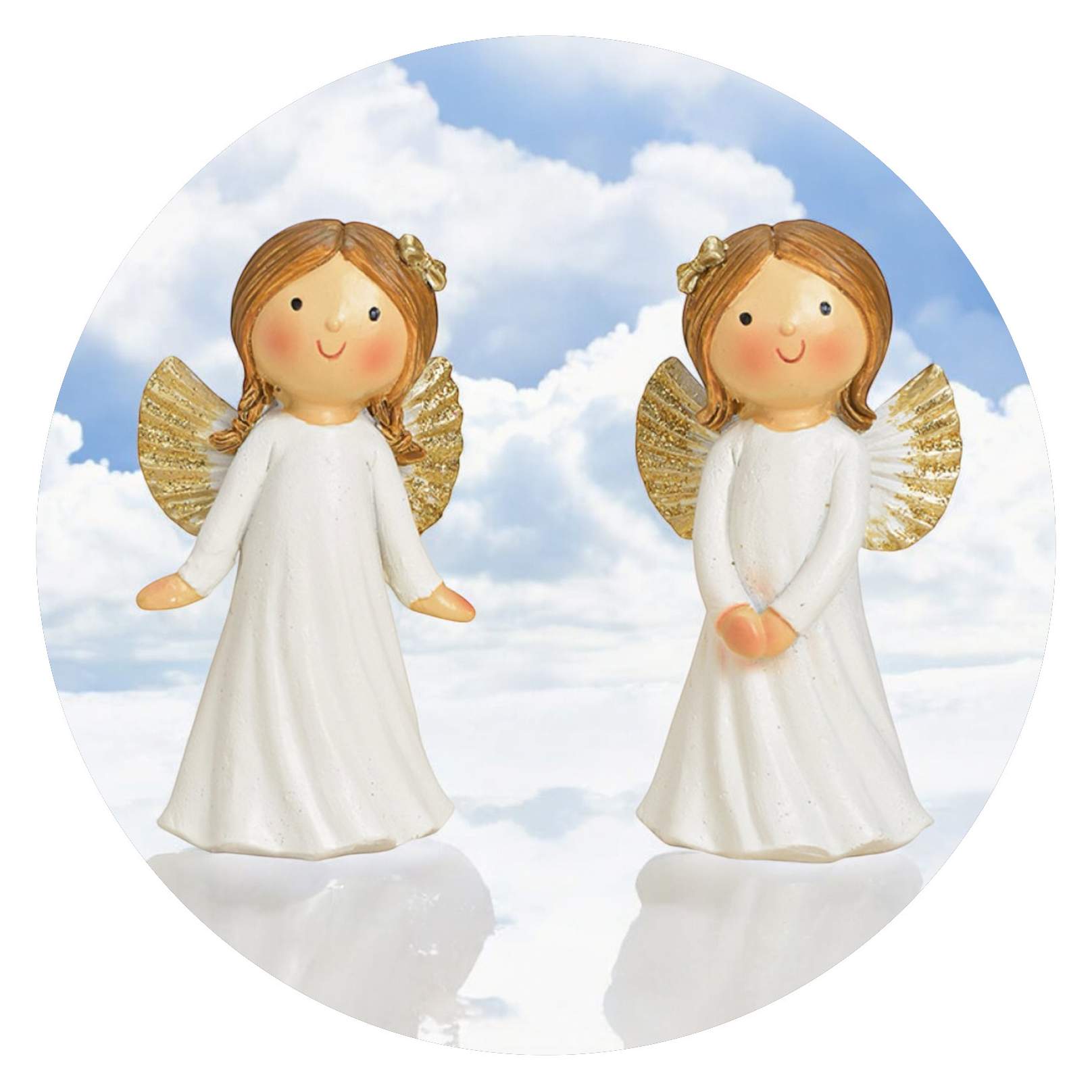 Ze zijn gewoon te schattig, deze engelenzusjes. Ze zijn gemaakt van sterk polyresin en geschilderd met gouden details, zoals het schattige strikje in hun haartjes en de randen van hun vleugeltjes. En ze zijn natuurlijk ontzettend lief. Ze staan glimlachend te kijken, alsof ze willen zeggen: Je doet het goed. Ik ben trots op je.
