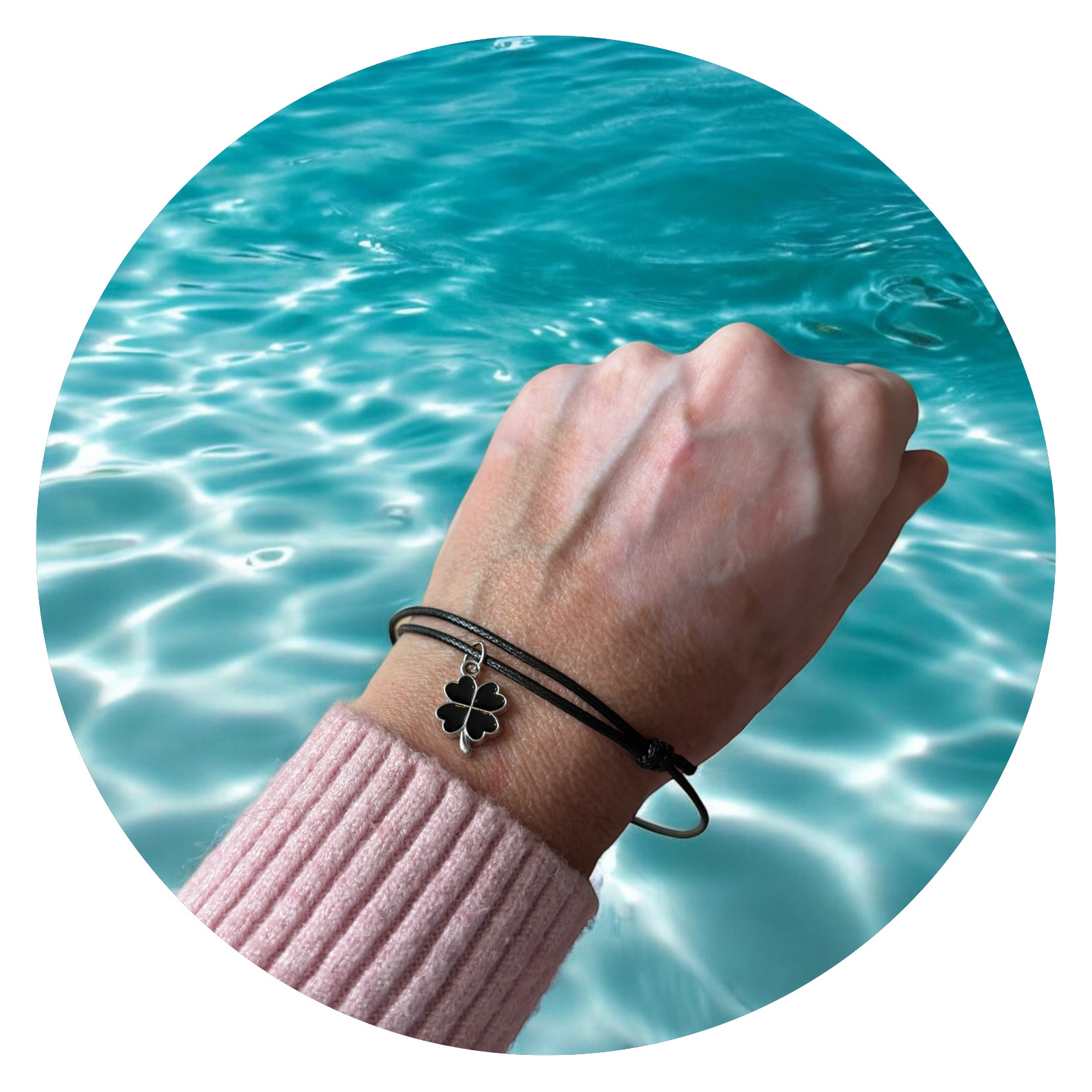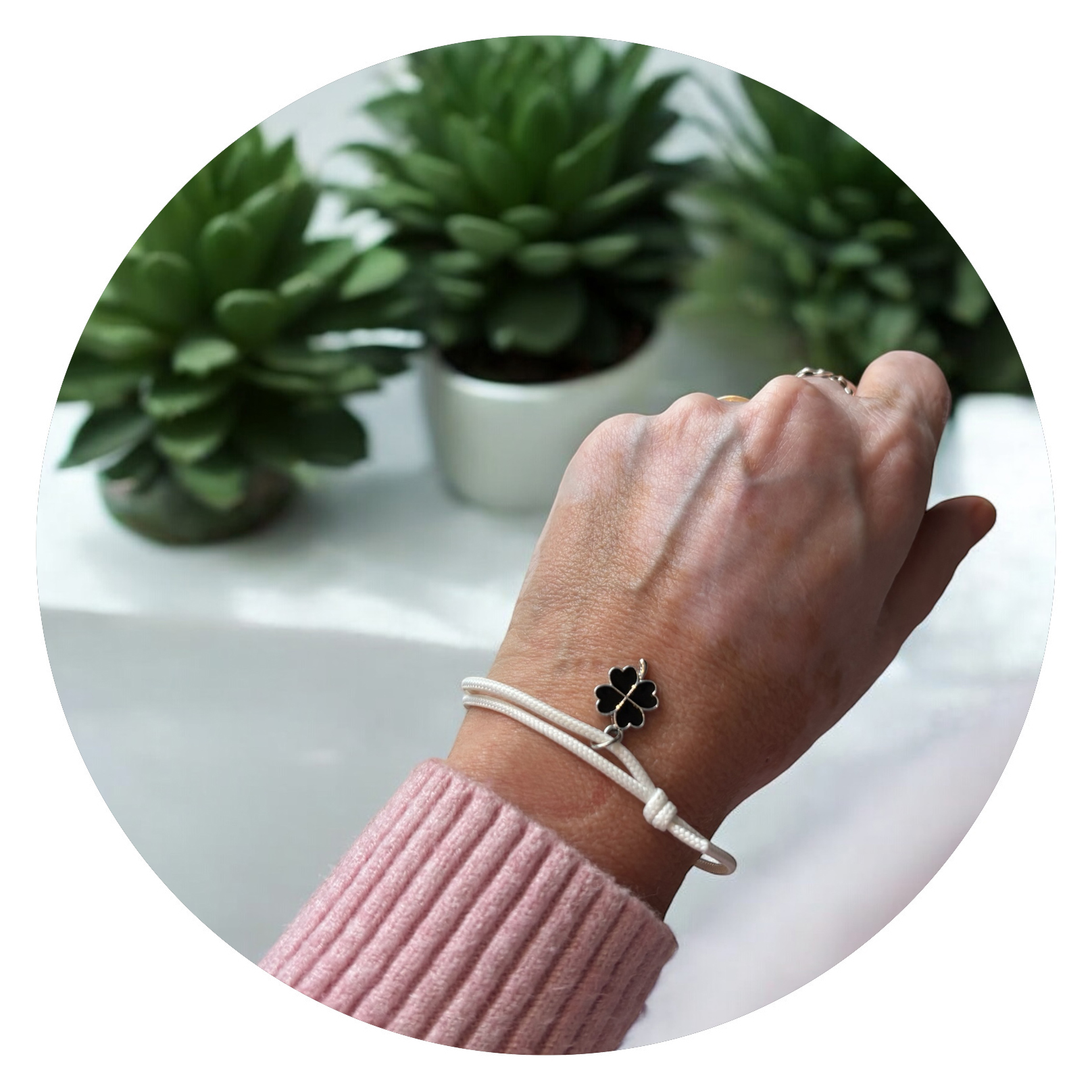 Een eenvoudig verstelbaar wit vetertje met daaraan een goudkleurig bedeltje in de vorm van een klavertje vier, ingekleurd met zwart, wit of groen. Inderdaad, een klavertje vier, waardoor je weet dat geluk binnen handbereik ligt!