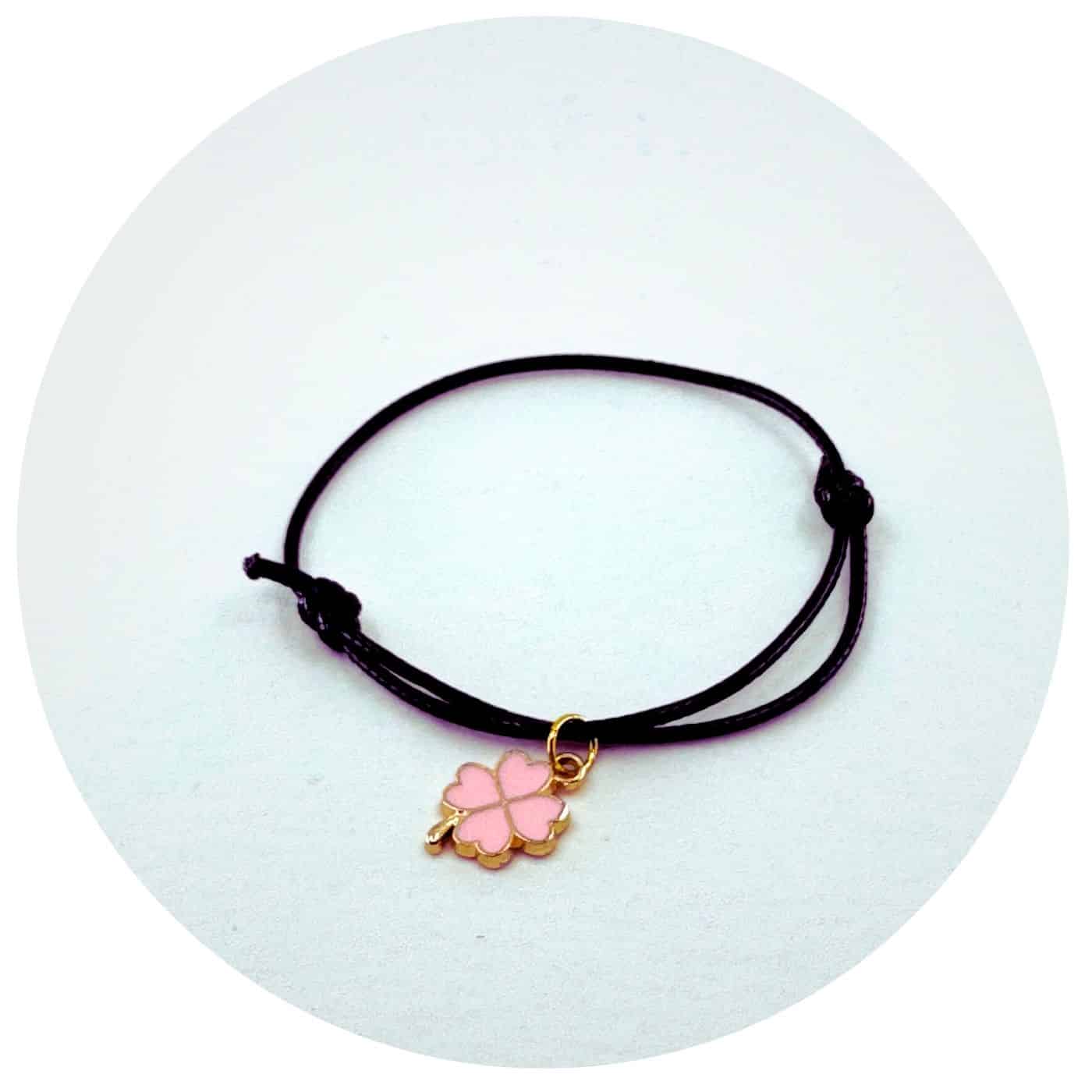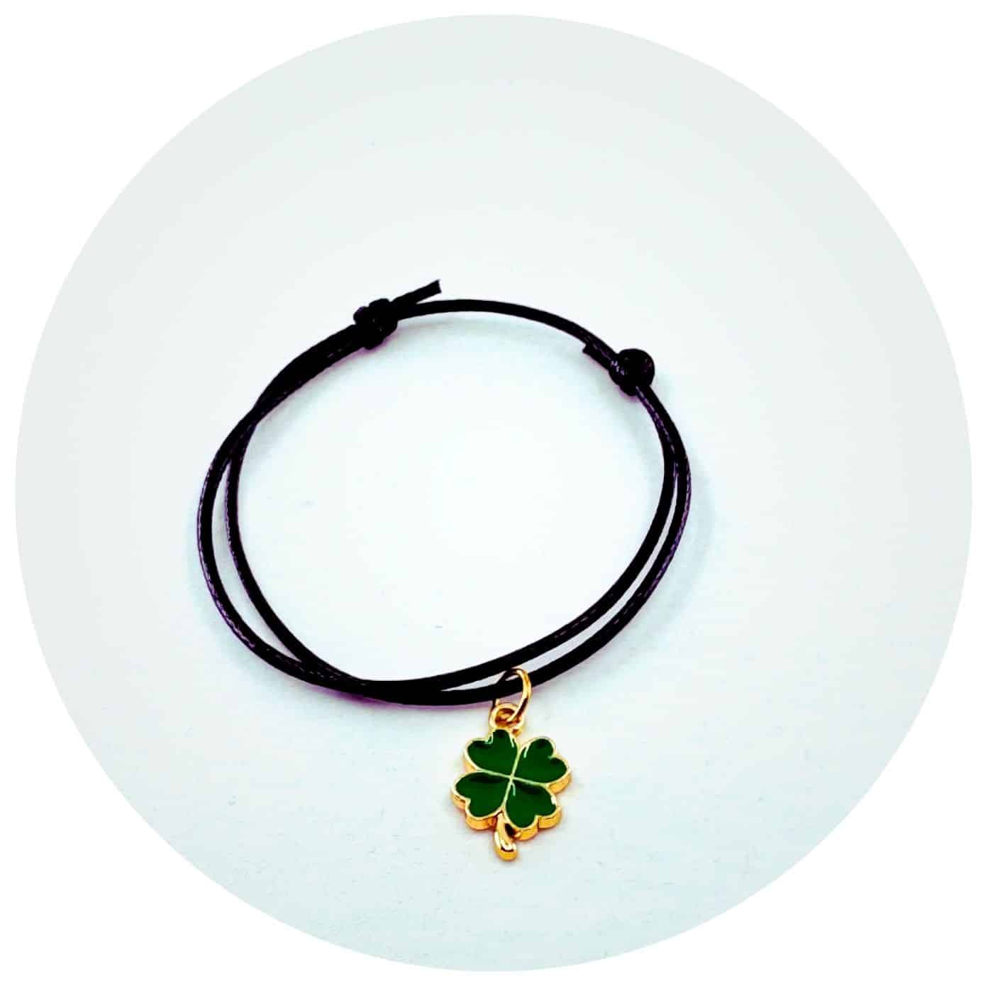 Een lief verstelbaar zwart vetertje met daaraan een goud- of zilverkleurig bedeltje in de vorm van een klavertje vier, ingekleurd met zwart, wit of groen. Exact, een klavertje vier, waardoor je weet dat geluk binnen handbereik ligt!