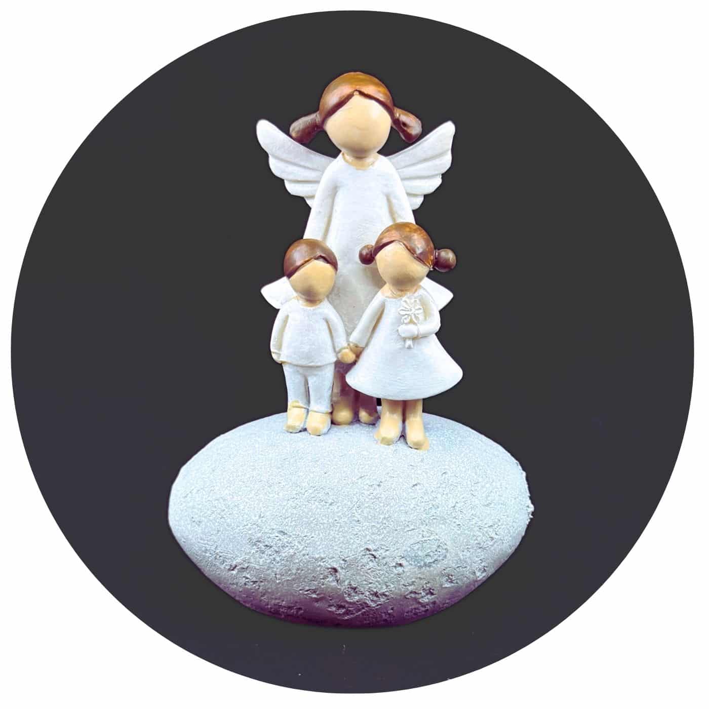 Dit beeldje toont een lieve engel die twee kinderen dicht bij zich houdt. De engel staat rustig en beschermend achter hen, alsof er altijd over hen wordt gewaakt. Het zachte wit en grijs, gecombineerd met de warme bruine tint van het haar, geven het geheel een rustige, liefdevolle uitstraling.