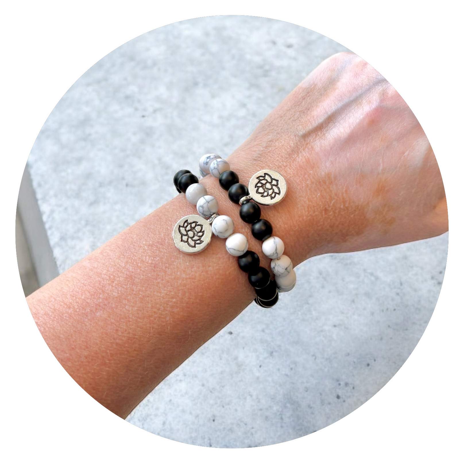Wit met een vleugje zwart, of zwart met een sprankje wit—je weet dat het leven altijd om balans draait. Of je nu een witte dag hebt met een klein wolkje, of een donkere dag met een straaltje zon, deze armbanden helpen je de balans te vinden. En als extraatje hangt er een lotusbloem bij, een subtiel symbool van groei en veerkracht. Perfect voor iedereen die af en toe een zachte herinnering nodig heeft: het komt altijd goed, zelfs als de boel een beetje in de knoop zit… (net als je armbandje soms).