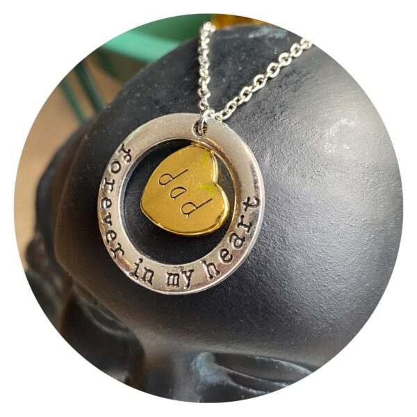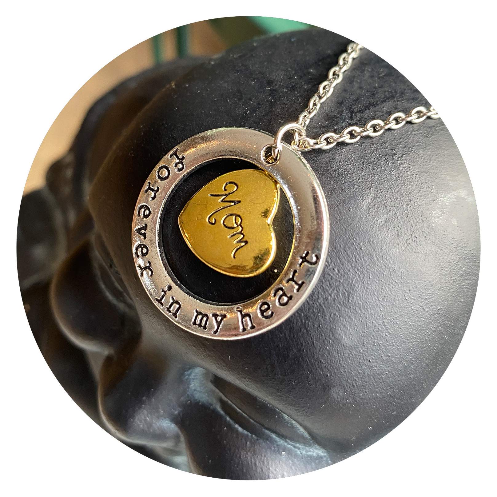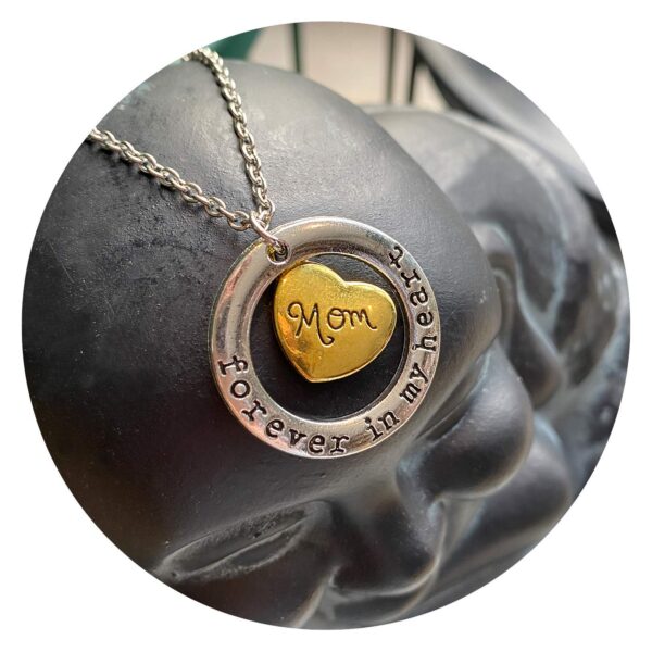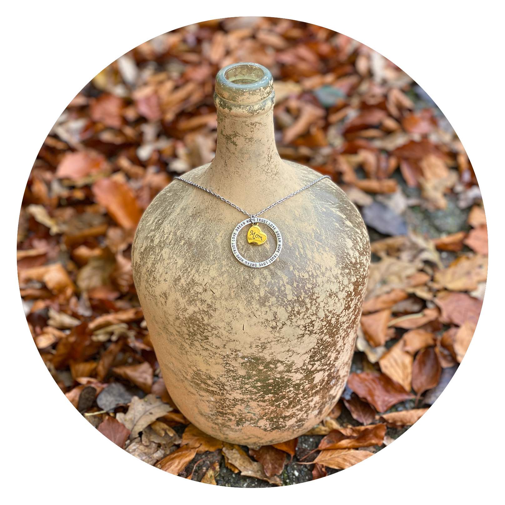 Deze ketting bevat een cirkel met de woorden ‘Dream’, Hope’, ‘Trust’ en ‘Love’, en een goudkleurig hartje met daarin ‘Mom’.