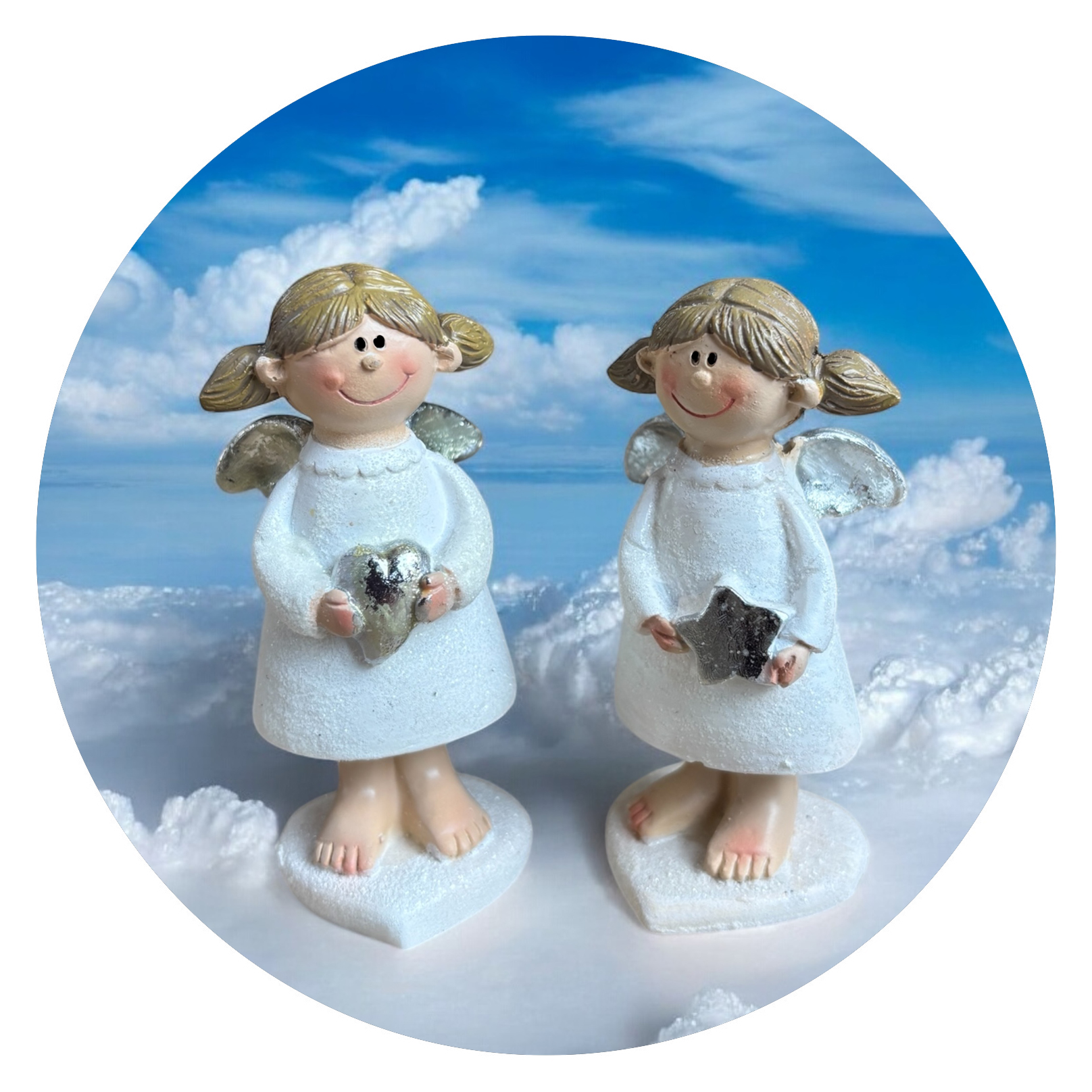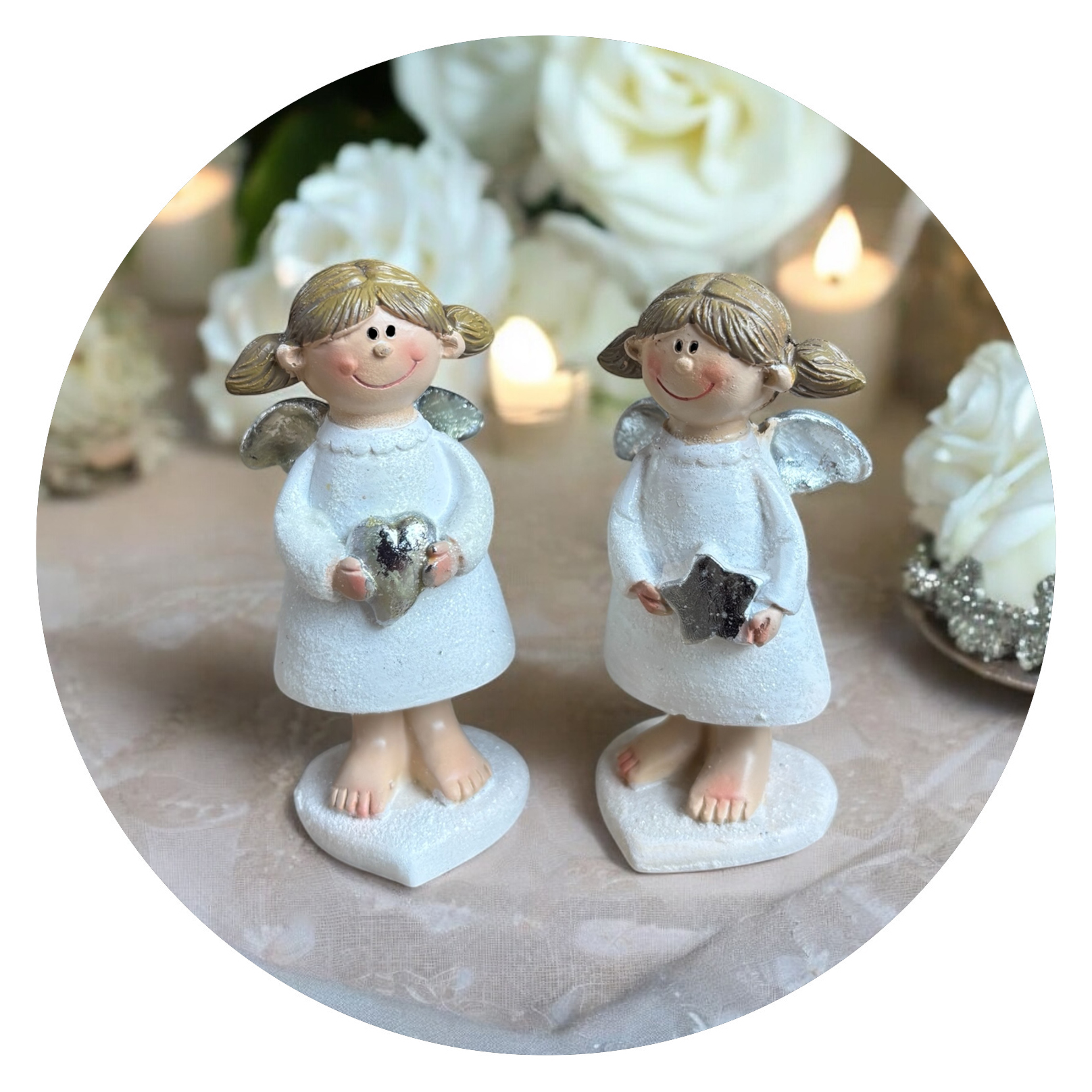 Deze twee ondeugende engelenzusjes stralen ieder op hun eigen manier. Met hun speelse staartjes en lieve blik brengen ze een vleugje licht en vrolijkheid in huis. Het ene zusje draagt een zilveren hartje – een symbool van liefde en warmte. Haar zusje houdt een fonkelende ster vast, als teken van hoop en magie. Zowel samen als individueel zijn deze lieve engeltjes een echte aanwinst.