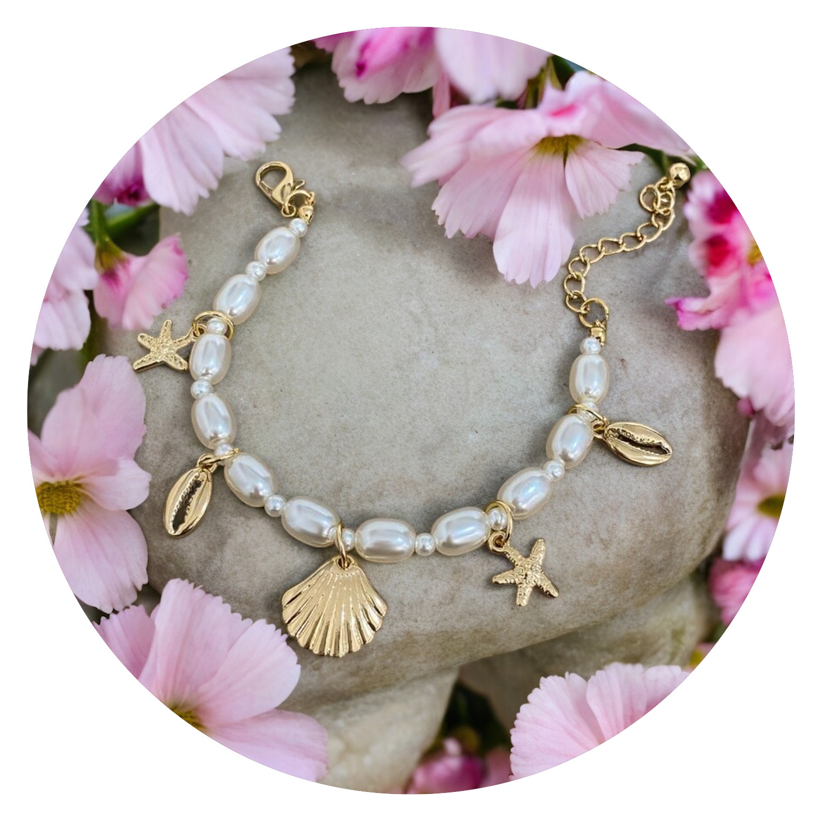 Oef, dit goudkleurige armbandje met zee-bedeltjes is wel ontzettend lief! De kraaltjes lijken net pareltjes, de bedeltjes doen ons denken aan vakantie maar ook de magie van de zee, maar vooral is dit armbandje een waar sieraad voor je pols. Chique, maar niet over the top. Stijlvol, maar zonder op te scheppen.