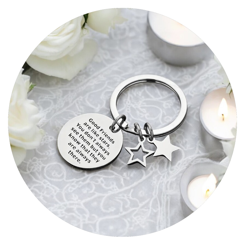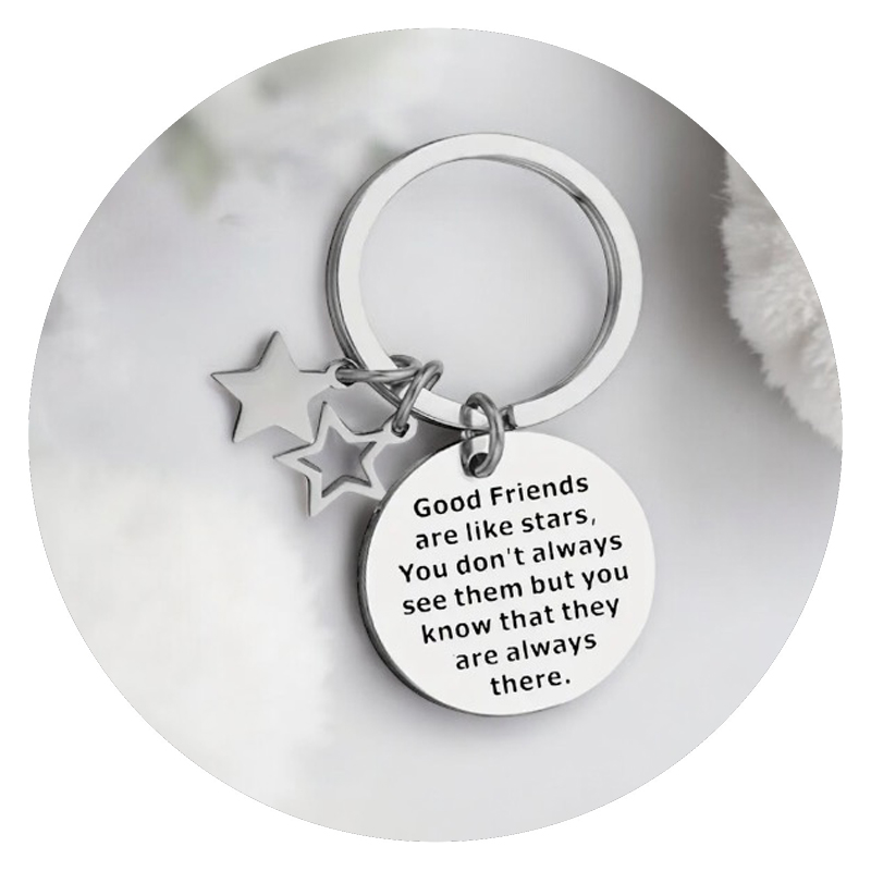 Deze sleutelhanger is een klein, maar wel een heel krachtig symbool van echte vriendschap. Aan de sterke sleutelring hangt een label met de tekst Good friends are like stars. You don’t always see them, but you know that they are always there. Tevens hangen er twee kleine, zilverkleurige sterretjes, aan. Eentje die open is en eentje die dicht zit, om aan te geven dat jullie weliswaar hetzelfde zijn, maar ook uniek.