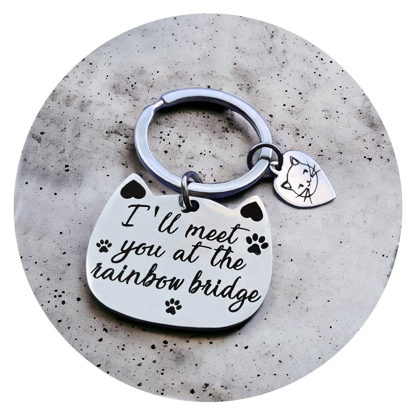 Deze schattige sleutelhanger is een liefdevol eerbetoon aan je dierbare kat. De tekst “I’ll meet you at the rainbowbridge” is een bekende uitspraak. Waar we voor mensen vaak aan de hemel denken wanneer ze overlijden, is voor huisdieren de term regenboogbrug vaak van toepassing.