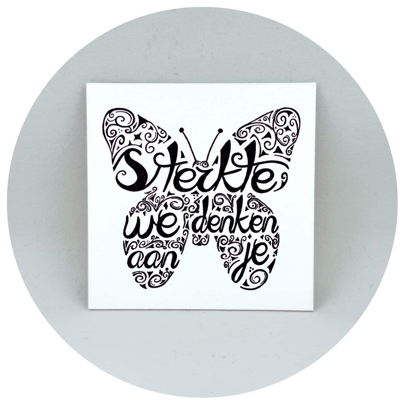• Wit & Zwart: Een serene witte kaart met de tekst “Sterkte we denken aan je” verwerkt in een sierlijke zwarte vlinder.