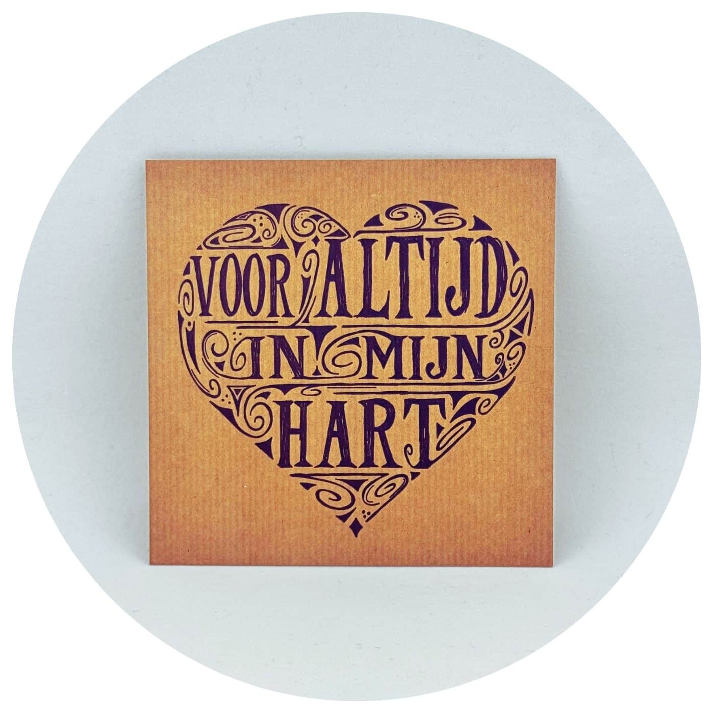 • Bruin & Zwart: Een warme, natuurlijke kaart van kraft-look karton met de tekst “Voor altijd in mijn hart” in een zwarte hartvorm.