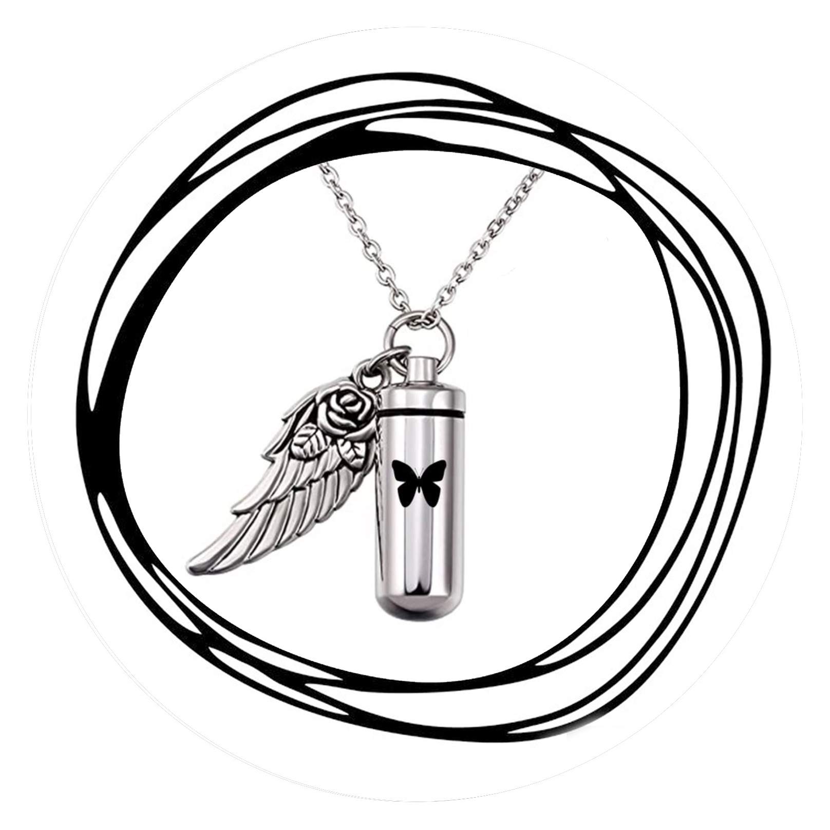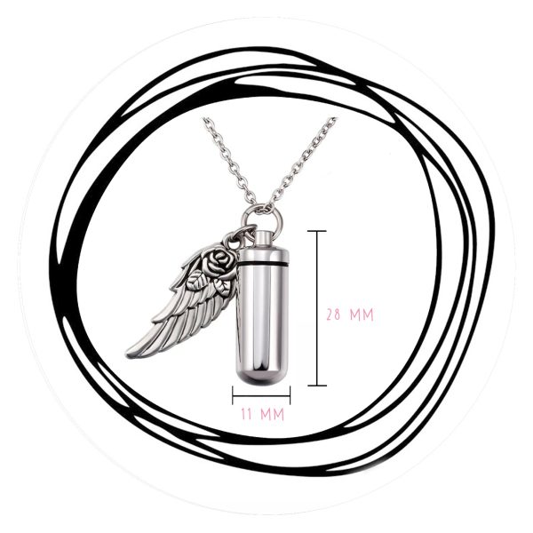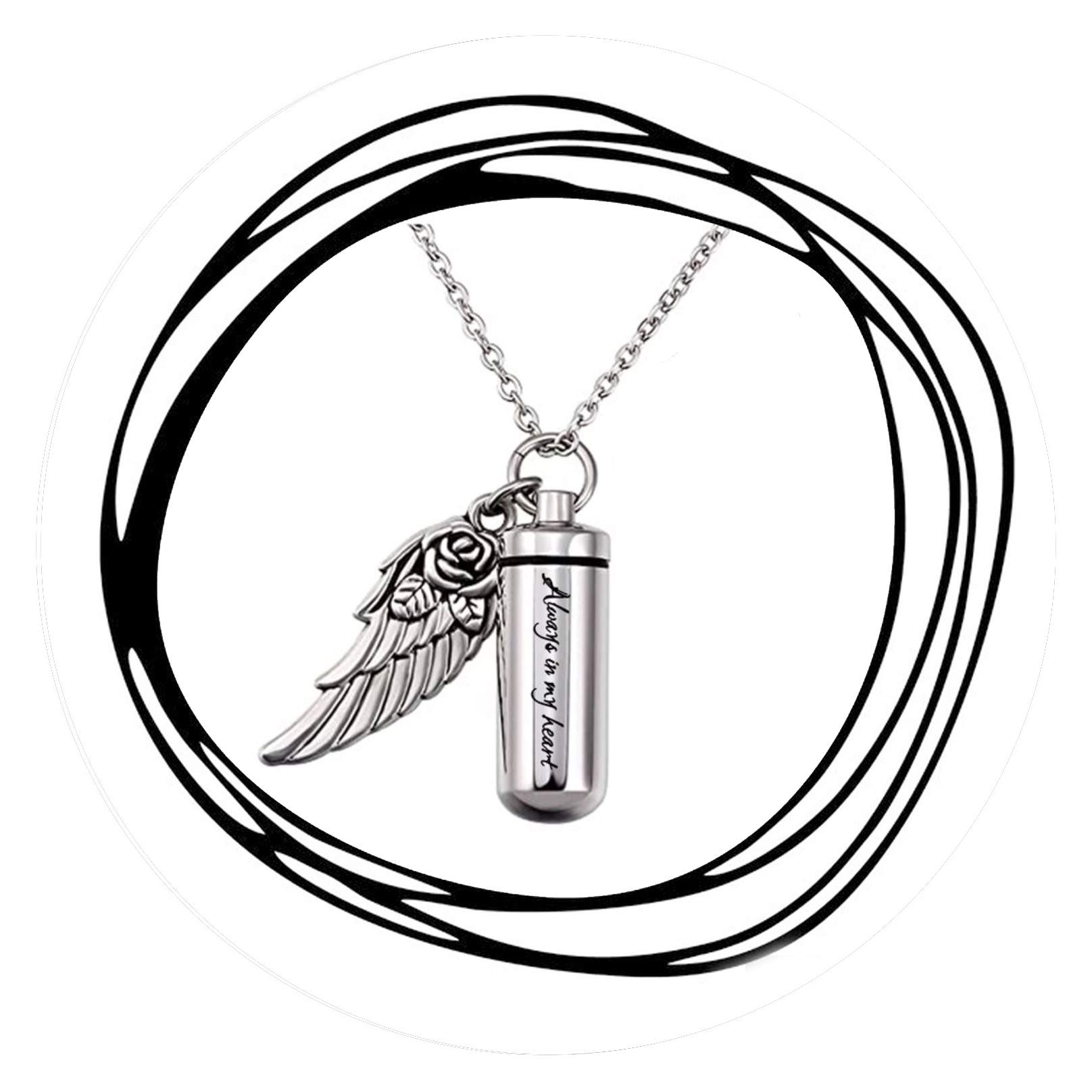 Aan deze ketting hangt een kokertje waar as in kan, plus een engelenvleugeltje.