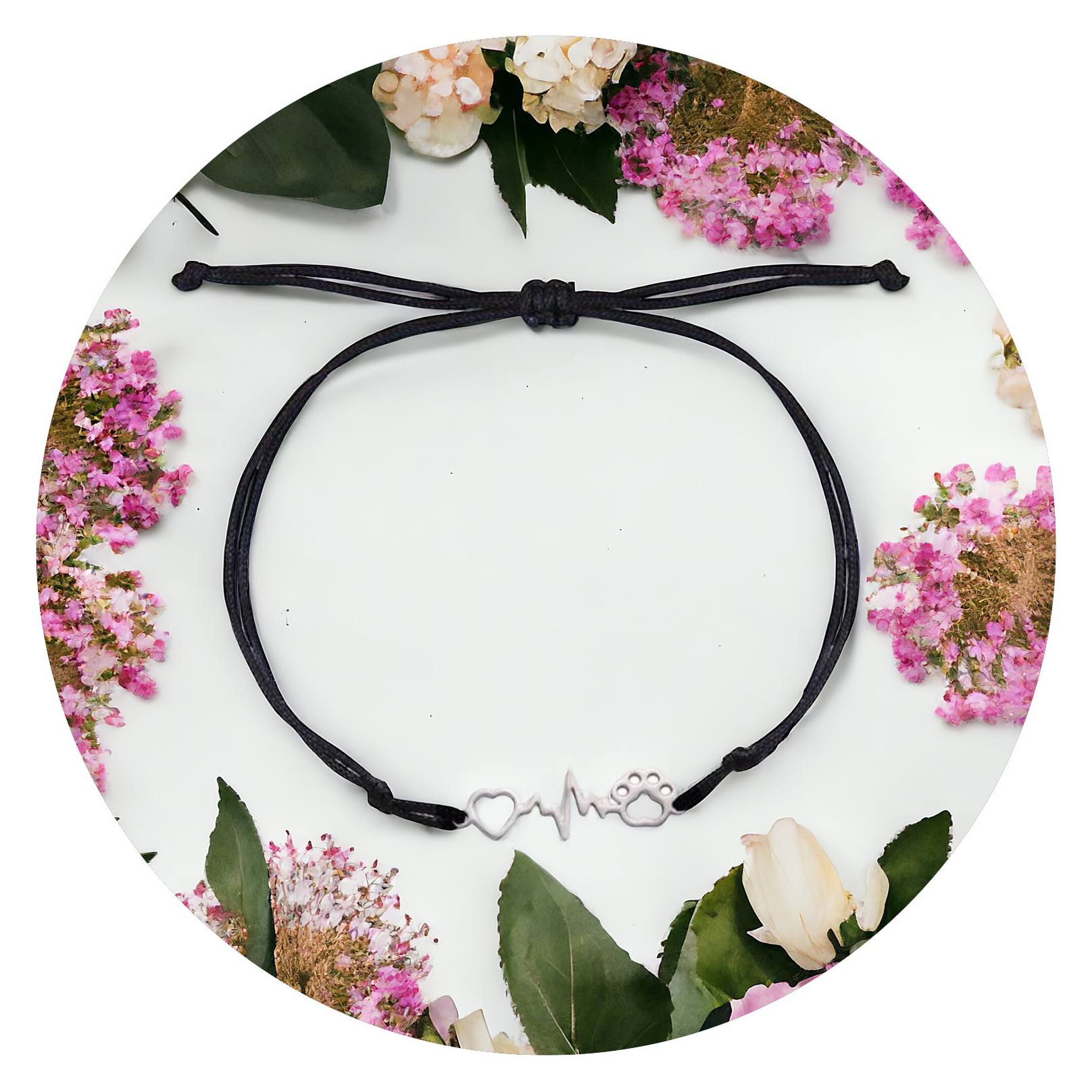 Een verstelbaar veterarmbandje met in het midden een zilverkleurig figuurtje met daarin verwerkt een hartje, een hartslag en een pootafdrukje.
