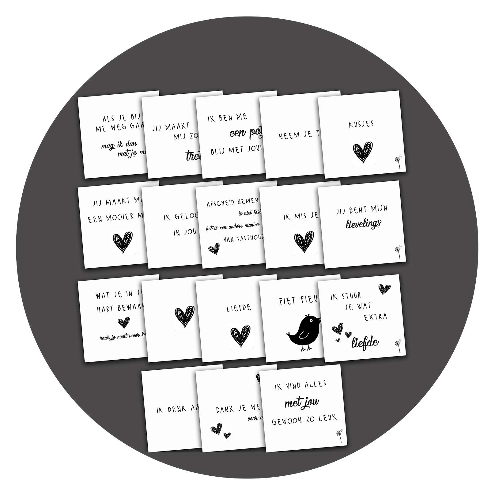 Alle 25 lieve zwart-wit kaartjes uit deze serie met voor zichzelf sprekende teksten. De achterkant van deze kaarten zijn volledig blanco, waardoor je daar je eigen boodschap kunt schrijven. De kaartjes zijn heel geschikt als cadeaukaartje bij een presentje, maar passen ook in een standaardenvelop mocht je hem willen versturen.