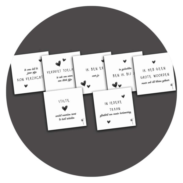 Wil je deze kaartjes, eventueel met bijpassend Troostcadeautje, rechtstreeks naar jouw dierbare laten sturen? Schrijf dan in het veld ‘Opmerkingen’ welke boodschap ik namens jou op een van de kaartjes mag schrijven en vul het adres in van jouw dierbare bij ‘Verzenden naar een ander adres’ tijdens het bestelproces.
